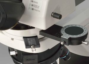 The intermediate tube incorporates a Bertrand lens as standard, enabling both the observation and capture of conoscopic and orthoscopic images. The Bertrand lens is focusable and centerable. The high precision slider-type analyzer is rotatable for a full 360°.